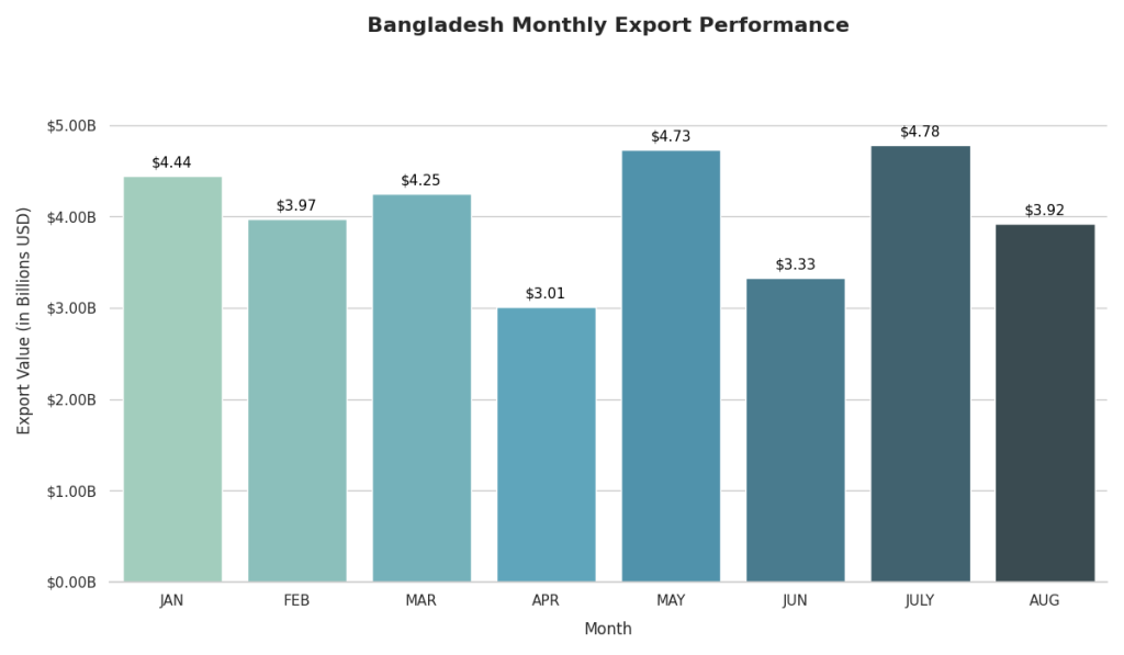 ইপিবি এর তথ্য অনুসারে অগাস্ট মাসে তৈরি পোশাক (RMG) খাত থেকে রপ্তানি আয় এসেছে ৩১৬ কোটি ডলার , যা ঐ মাসের মোট রপ্তানি আয়ের প্রায় ৮১ শতাংশ । তবে গত বছরের অগাস্ট মাসের তুলনায় তা কমে দাঁড়িয়েছে ৪ দশমিক ৭৫ শতাংশ ।